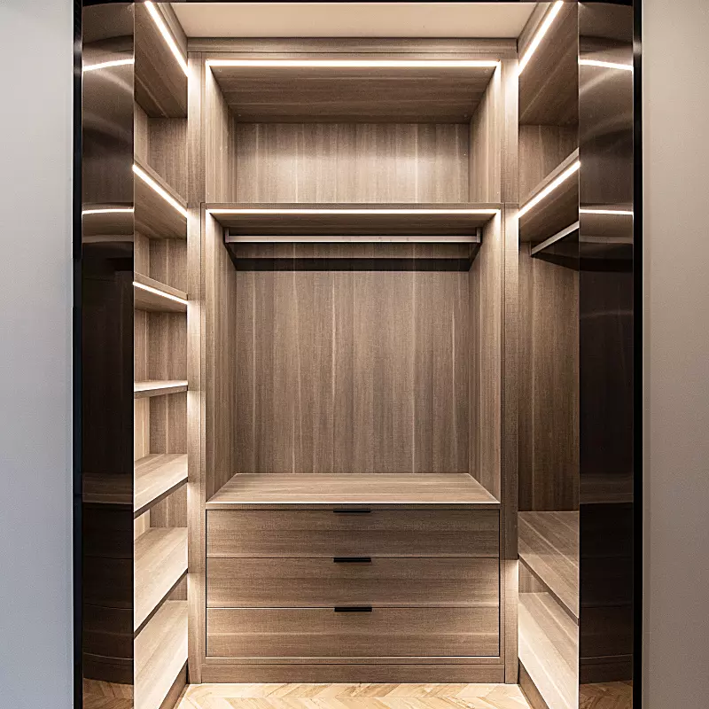 The interior space has been meticulously planned, featuring adjustable shelves, sturdy hanging rods and dedicated accessory drawers to meet all your storage needs, from suits and dresses to accessories. Everything is in perfect order, making daily dressing a pleasure.